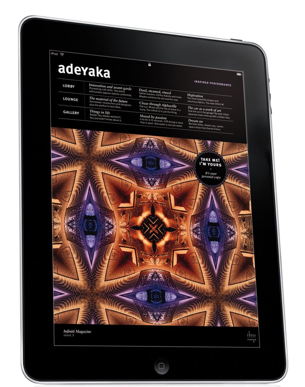 In publishing an iPad version of adeyaka, Infiniti will be underscoring its pioneering role in corporate publishing. The Web version of the magazine (www.adeyaka.com) already set new yardsticks upon its publication in 2008, winning the gold prize in the “Best of Corporate Publishing Award” in 2009: the most important European distinction for corporate communication. In terms of content and design, the iPad version of adeyaka will orient itself towards the print edition of the magazine, but also offer the reader new and interesting opportunities of experiencing brand content, thus increasing the communications performance of the brand. adeyaka for iPad will be available from the Apple iTunes Store from May, 2010.