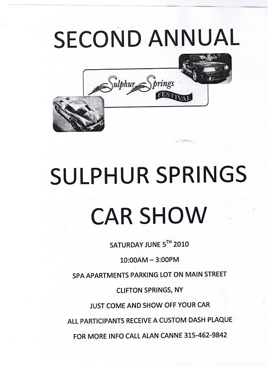 2nd Annual SULPHUR SPRINGS CAR SHOW to be held June 5, 2010 in Clifton Springs, NY
