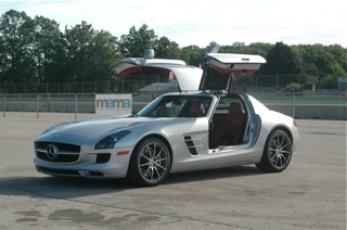 The SLS AMG, exotic super car will go 0 to 140-mph and back to 0 in a couple hundred yards, claimed one of my colleagues who was still flush from his drive. I didn’t realize until it was too late that it was not just for display but do drive as well. Bummer! Entirely built by AMG this coupe looks a bit out of proportion from some angles but with the wings up and in the morning light it looks mighty sexy. Certainly, there are some styling queues from the original SL300 Gullwing. This one has brake discs as big in diameter as the wheels were on the original SL300 Gullwing.