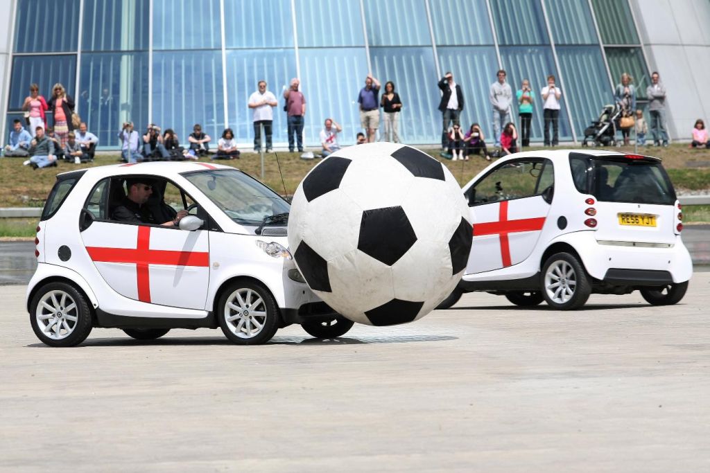 MILTON KEYNES, UNITED KINGDOM – June 16, 2010: England takes on the rest of the world as eight smart cars entertain the crowds at Mercedes-Benz World during the World Cup.