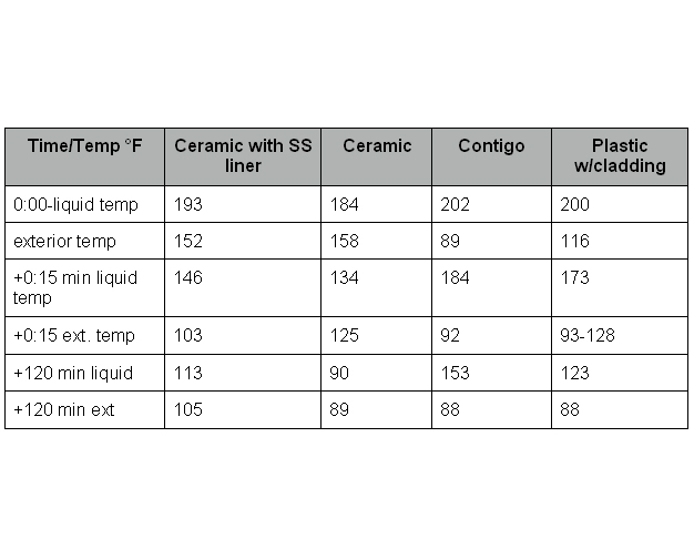 The test was designed to simulate a familiar two-hour commute to Detroit. Thus we filled each container with near-boiling water to about half an inch below the rim and measured the internal and external temperatures. This is the result. One surprise was the heat of each surface; most were too hot to hold comfortably, obviously the reason we have evolved to the use of handles and properly elevated pinkies whilst imbibing. (Note that the Contigo and generic are tumblers with no handles.)