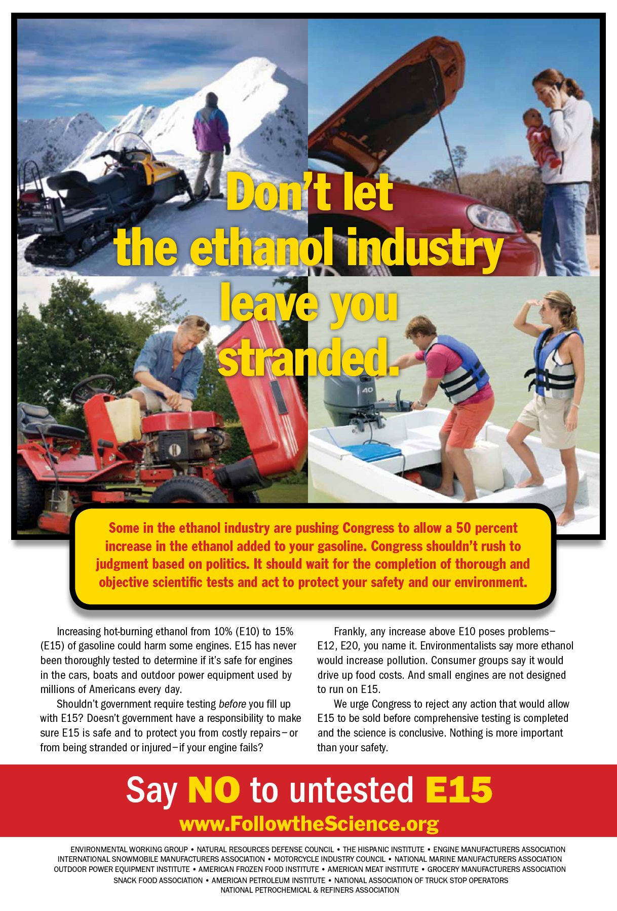 "Increasing hot-burning ethanol from 10% (E10) to 15% (E15) of gasoline could harm some engines," the ad continues. "E15 has never been thoroughly tested to determine if it's safe for engines in the cars, boats and outdoor power equipment used by millions of Americans every day."