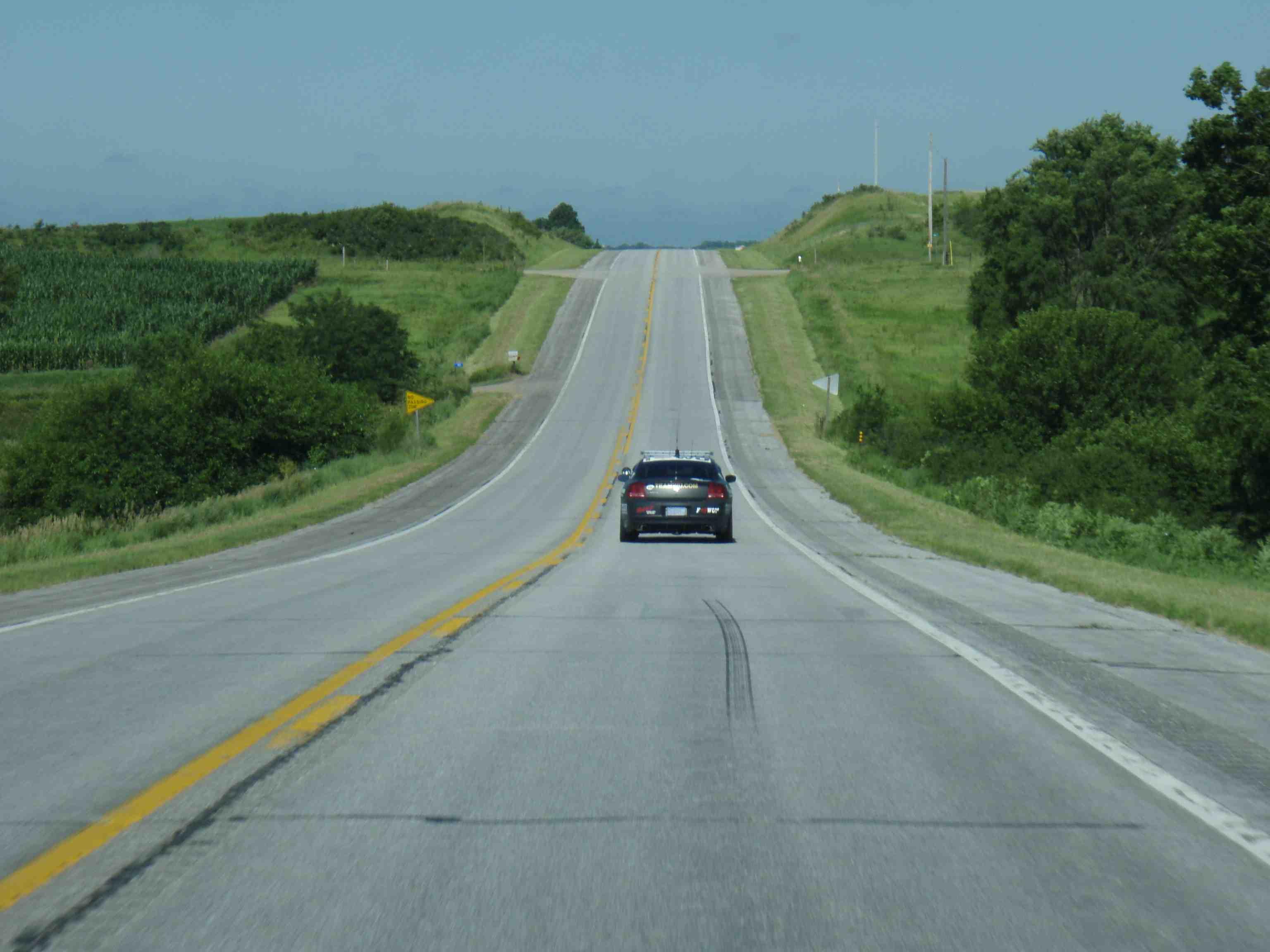 We’re the biggest thing that Omaha’s seen on a Monday night – or possibly any night (not counting any Warren Buffett sightings) – and a good time is had by all, except the Bullrunner who does a light squeal of his tires upon leaving dinner and is ticketed by an officer on horseback, surely a rally first. The police presence continues next morning with an escort out of town; always a good way to ensure a speedy exit but also to know, surely, that your escort’s colleagues are lying in wait down the road. And indeed they are in unbelievable numbers. Nebraska has taken a page out of Iowa’s handbook and, seemingly, mobilized its entire force, with one team pulled over by what looks like a gardener’s pick-up truck! Seeking an alternate route, we follow Team Wu – always at the top of the navigation game – onto an adjacent road that’s traffic and cop free, dead straight and surrounded by nothing but corn for miles in every direction.