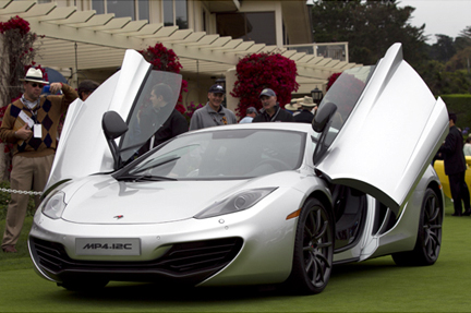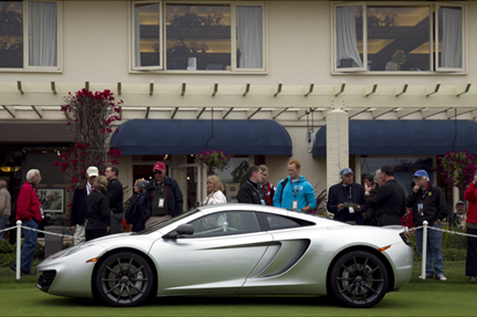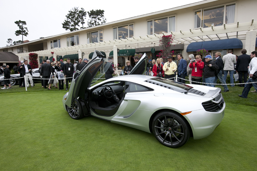 PEBBLE BEACH, CA - August 25, 2010: A Supernova Silver 12C, Titanium Silver 12C and the XP13 rolling chassis were presented to over 1,000 guests at the Pebble Beach event by a McLaren Automotive team including Managing Director Antony Sheriff and Design Director Frank Stephenson. Visitors to the McLaren Automotive display included Governor of California, Arnold Schwarzenegger and world-famous car collector, Jay Leno.