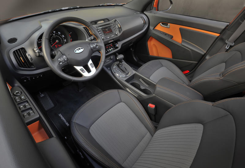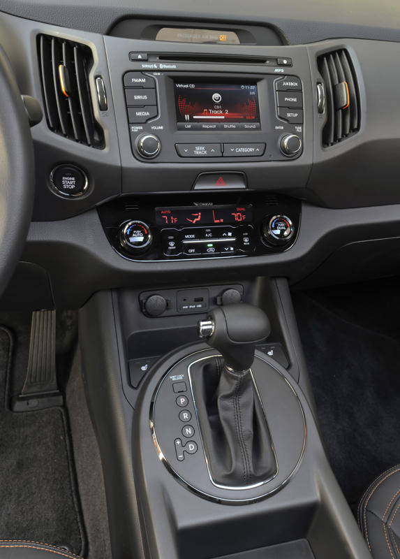 Engineering & Techno-speak – a 2.4 liter, four-cylinder engine with continuously variable valve timing provides 176 hp and better fuel economy than the previous model Sportage V6 powerplant. There’s an optional 2.0 four-cylinder engine with turbo that delivers V6 power and a 100 more hp. Fuel ratings are an acceptable 21 city/28 hwy mpg. It’s available in all-wheel or front wheel drive models with either a six speed automatic with Sportmatic® clutchless shifting or six speed stick. I drove both and liked the automatic in-town (San Francisco traffic can be disconcerting) and the stick on the highway. Making a decision I would suggest the automatic for most drivers.