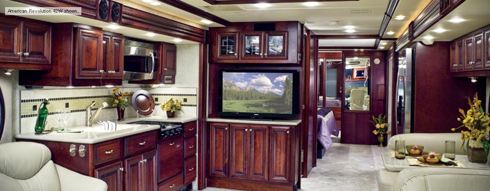 The 2011 American Revolution features three 42-foot floor plans: a full-wall slide model with rear walk-in closet (42T); a full-wall slide model with rear bath (42W); and a quad-slide, side-aisle model with gourmet galley. Standard amenities on American Revolution include Sony® Blu-Ray Home Theater System, Villa furniture, powered front privacy blinds, full tile throughout, power generator slide, Aqua Hot® heating system, residential refrigerator, and dual in-dash monitors.