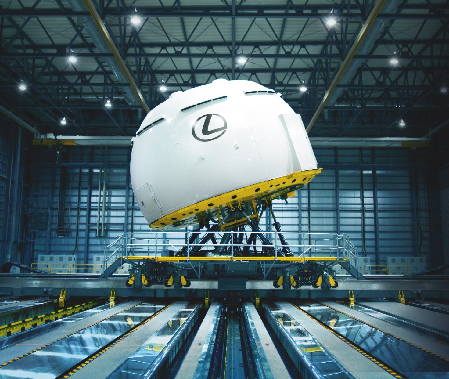 In a large, unassuming building on the company's research campus in Higashifuji, Japan, sits the largest and most advanced driving simulator ever built. A series of complex, interlocking full motion tracks span the interior of a room the size of a football field. On top of the tracks sits a round domed structure, approximately 15 feet high and 56 feet in diameter, supported on a full three-axis hexapod system.