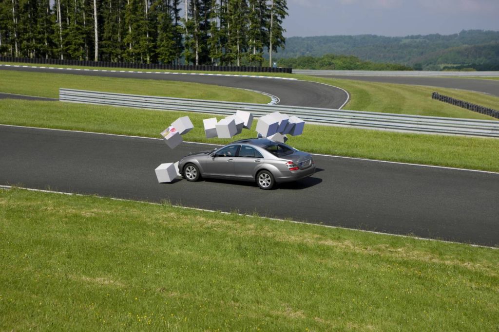 Here, Mercedes-Benz is using three simulators to demonstrate the effectiveness of innovative safety systems. For the first time for this purpose, the PRE-SAFE demonstrator uses a linear motor to accelerate the vehicle cabin to up to 16 km/h within a distance of four metres. This corresponds to an acceleration of two g, i.e. twice freefall speed. After around 1.2 seconds the cabin impacts the specially designed hydraulic shock absorbers. In the interim the occupants not only experience the effects of the PRE-SAFE functions at first hand, e.g. belt pretensioning, NECK-PRO and the inflatable side bolsters on the seats, but also the restraining effect of the seat belts during the impact. The assistance systems simulator enables testers to discover in a realistic way how a range of assistance systems work in an S-Class under different road and traffic conditions. The ATTENTION ASSIST simulator reconstructs the effects of driver fatigue.