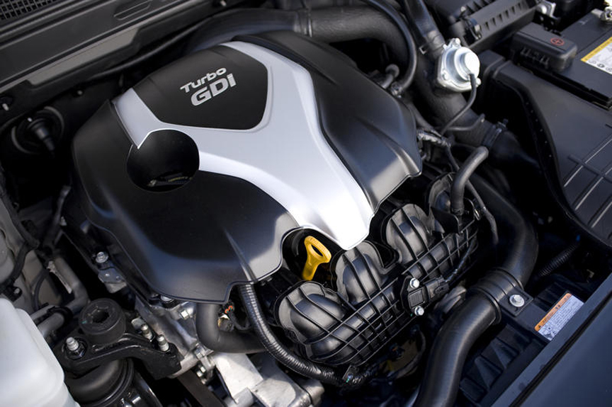 The result is an amazing 4-cylinder powerplant that produces 274 hp and 269 lb of torque at 1,750 rpm with regular fuel with 22 mpg city and 33 mpg highway. And that's more horsepower and better MPGs than 6-cylinder engines of its competitors. Hyundai calls this merger of power and fuel efficiency with reduced emissions their Blue Drive product strategy.