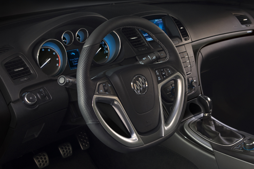 MIAMI - November 5, 2010: Last night Buick revealed the production version of the 2012 Regal GS, an even sportier expression of the Regal sport sedan that went on sale earlier this year and has attracted new buyers to the Buick family. Powered by a high-output, exclusive Ecotec 2.0L turbocharged engine mated to a six-speed manual transmission, the GS delivers an estimated 255 horsepower (190 kW) and 295 lb.-ft. of torque for a 0-60 mph performance of less than seven seconds (estimated). Buick’s Interactive Drive Control System is standard on the GS, allowing drivers to customize the driving experience by changing the suspension settings and steering sensitivity between three modes: standard, sport and GS.