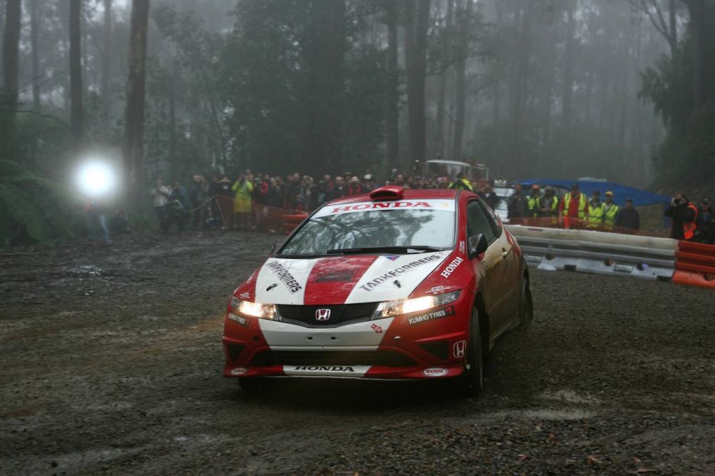 The first two stages on Friday were run in the dry, with a mishap putting the Honda towards the middle of the field after Pioneer 1 and 2. Lardner Park was home to the Super Special Stages later that night. The heavens eventually opened, sending the crowds running for cover and the cars sliding all over the stage. The Honda finished in seventh.