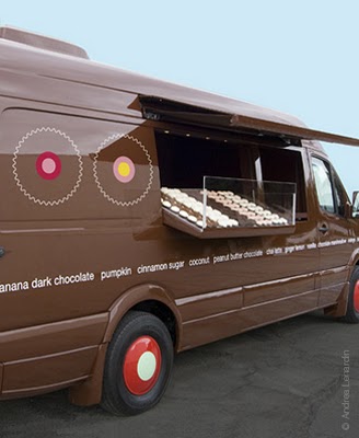 Designed by Sprinkles' architect, Andrea Lenardin and customized by West Coast Customs, the Sprinklesmobile is equipped to deliver freshly baked cupcakes directly to the consumer. Outfitted with an 2800 watt electric generator and rear air-conditioning unit, this fuel-efficient clean diesel van has the ability to deliver up to 1,500 cupcakes to loyal customers while getting 22 mpg. Additional modifications include: pivoting, height-adjustable serving counter, power-retractable awning and a trademark Sprinkles "modern dot" logo wheel covers.