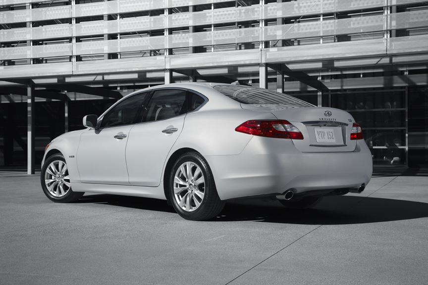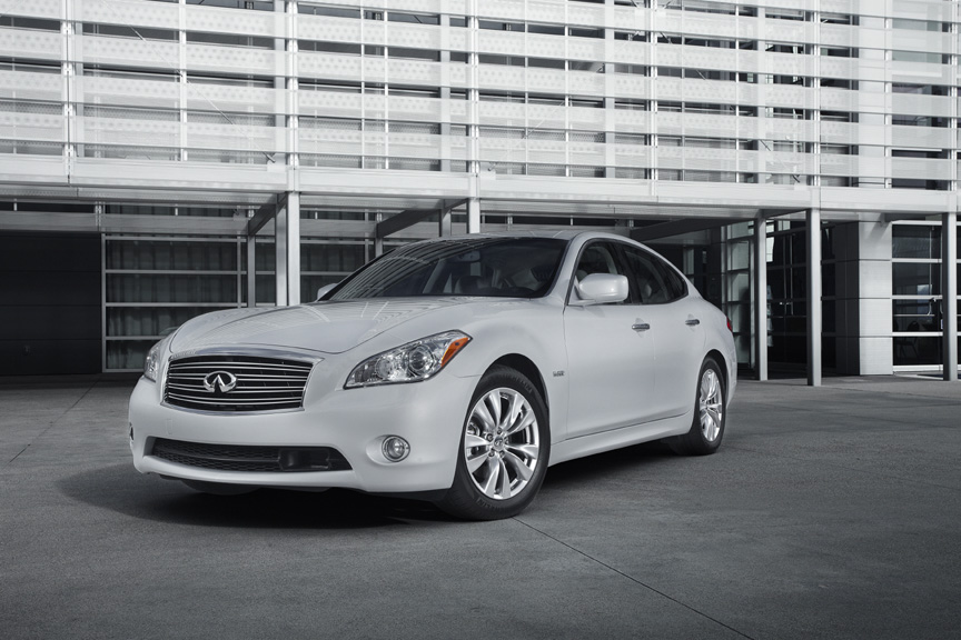LOS ANGELES - November 18, 2010: Infiniti today unveiled its first production hybrid performance luxury sedan, the all-new 2012 Infiniti M35h, during a press conference at the Los Angeles Auto Show. The new Infiniti Hybrid, which is set to launch at Infiniti retailers nationwide in spring 2011, stands to break new ground as the first true luxury performance "driver's" hybrid and the only vehicle to offer more than 350 horsepower and 30 miles per gallon fuel economy (estimated Highway mpg, official EPA figures not available at press time).