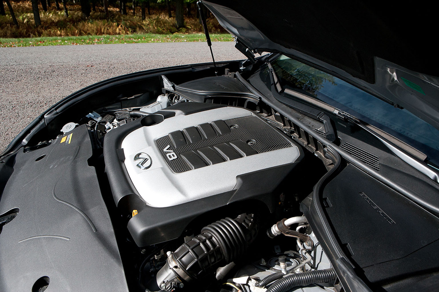 The 2011 M56 is offered in rear wheel drive or all wheel drive configuration. The M56 has the 5.6 liter 32-valveV8, aluminum-alloy block and heads. Low-friction coated pistons with Double overhead-camshafts with 4 Valves per cylinder with microfinished camshafts. Variable Valve Timing Control System (CVTCS) optimizes opening of intake and exhaust valves. Improvements over the previous generation 4.5 liter have increased efficiency by ten percent. The new engine is 1.1 liters more than the previous engine developing 100 more horsepower. Like the Infiniti FX50 the all-new Infiniti M56 models use the VK engine architecture. VK was previously known as the ZH used in the Q45, FX45, M45, and numerous performance Nissan vehicles.