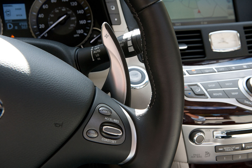 Infiniti offers adaptive cruise control on the M37/M56 that they call "Distance Control Technology." The system provides enhanced functionality of adding speed and distance intervals to standard cruise control. It helps you keep a safe distance from the vehicle in front of you: It slows when approaching a car in front of you and then when there's sufficient safe distance it accelerates to the preset speed as traffic flow increases. Distance control assist, Infiniti states is an industry-first, intuitively helps the driver release the throttle and subtly applies the brakes as needed in slowing traffic. I first used the system in a Corvette ten years ago and the improvements in software have made this system a real safety feature.