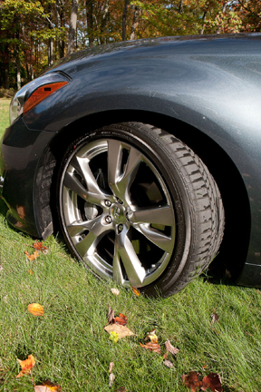 My test vehicle was the M56 rear wheel drive model that had the optional Sport wheels and tires. The larger 20-inch, with 5-spoke aluminum-alloy wheels with 245/40R20 W-rated summer performance tires. The Infiniti M37 and M56 models all have a temporary spare. USE PHOTO JPEG VE 8R2784 The larger tires allow for better braking of the M56 models. The M56 I drove had the optional sport package braking system, which included aluminum 4-piston opposed front calipers with 14 inch ventilated disc. The rear brakes have 2 opposed rear calipers 13 inch ventilated disc. Stopping from 70 to zero is done in 166 feet.