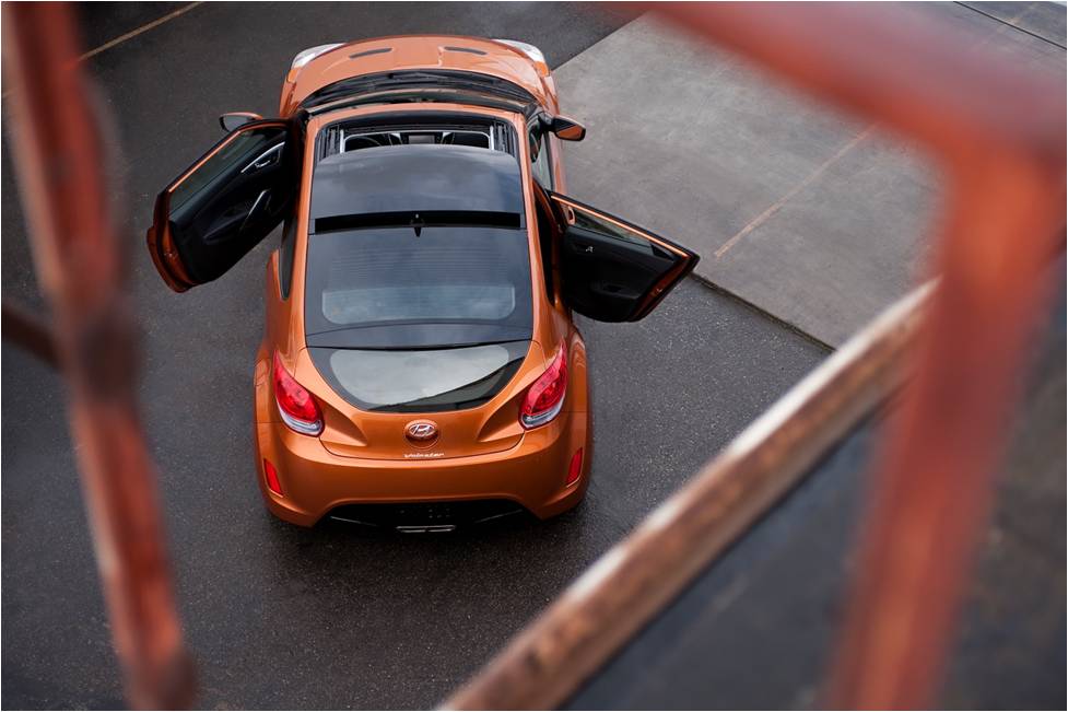 Veloster combines the style of a coupe and the functionality of a hatchback, while also incorporating an additional passenger-side door. In the past, some coupes have used smaller rear-hinged access doors. These coupes have always been compromised by having to open the driver-side door before the rear door could be opened, proving to be inconvenient for both the driver and passenger, and extremely difficult to operate in tight parking lot situations. Hyundai’s fresh take here implements a conventionally hinged door on the passenger side of the Veloster, providing safe and ready access to the surprisingly spacious rear seats. The passenger-side rear door handle is hidden to maintain the coupe design.