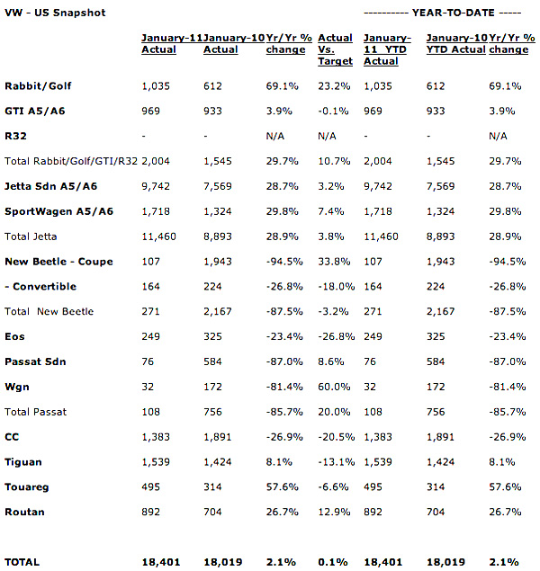 HERNDON, Va., February 1, 2011 -- Volkswagen of America, Inc. today reported 18,401 units sold in January 2011, a 2.1 percent increase over prior year sales. TDI Clean Diesel sales were up 51 percent over January 2010; and Jetta sales were up 28 percent, lead by the all-new Jetta.