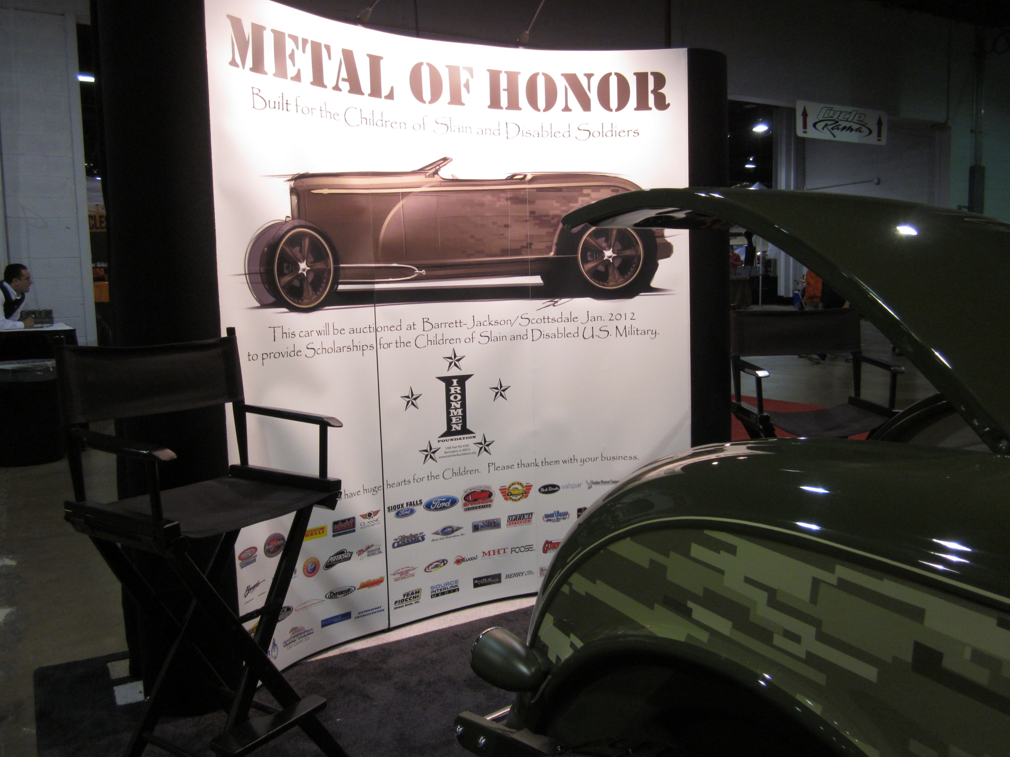 Metal of Honor was unveiled at the Grand National Roadster Show in Pomona, California in January 2011. Next stop was the Detroit Autorama in February and it just wrapped up an appearance at the Chicago World of Wheels. The plan is to show the car at every National Street Rod Association (NSRA) show in 2011 and appear at SEMA in Las Vegas in November 2011. Touring the U.S. and appearing at car shows, civic events, and military installations was made possible by the donation of a Ford HD truck and trailer by Sioux Falls Ford, a Ford dealer.
