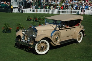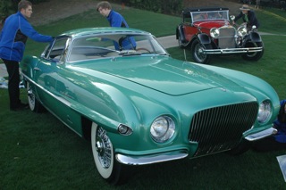 Best in Show Concours de Sport honors go to the big, yellow 1935 Duesenberg SJ Speedster known as the “Morman Meteor” owned by Harry Yeaggy of Cincinnati, Ohio. This car was built to set speed records on the Bonneville salt flats. It features just one headlight down low to light up the line along the salt that defines the track. Large chrome letters spell out “Duesenberg” along both sides of the hood and a big, long exhaust pipe emerges from the right side of the hood projecting all the way to the rear gaining diameter as it flows rearward.