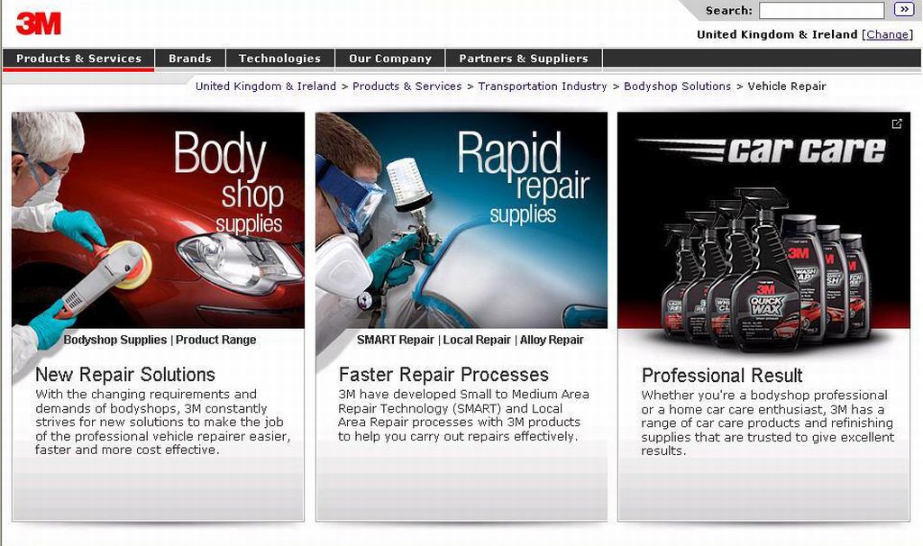 The site is now split into three sections, covering bodyshop supplies, rapid repair supplies - including SMART (small and medium area repair technology), local area repair, and alloy wheel repair - and the 3M Car Care range of professional car care products.