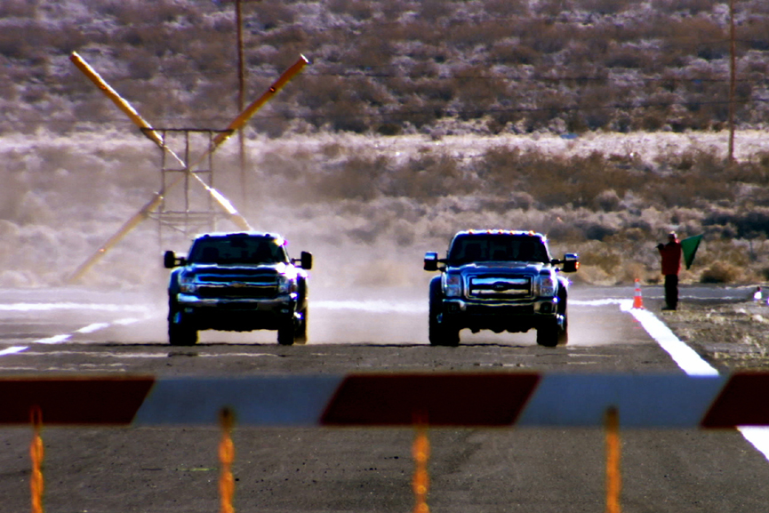 The tests include acceleration, passing, and braking tests, all conducted with a loaded bed, or in some cases, a loaded trailer. Other tests measure the effectiveness of the exhaust brakes on long downgrades and the stiffness of the frames during twist-ditch simulations. Competitors were diesel-powered 2011 Ford Super Duties, and in some tests, 2011 Dodge Ram HDs.