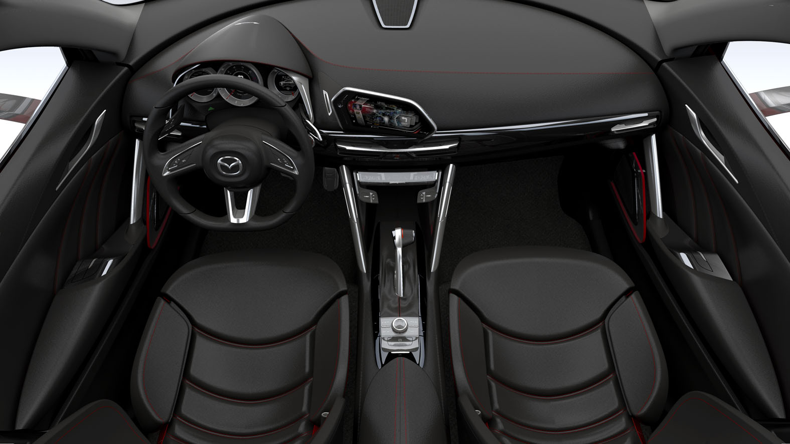 A deep, black interior is highlighted by red accents in the rear seatbacks as well as on the door armrests. Four satin chrome struts support the instrument panel, each rising upward in an image of vertical strength. The design of the instrument cluster itself as well as surrounding switches emphasizes the snug yet elegant nature of the driver-focused interior cabin while expressing Mazda’s sporty ethos.