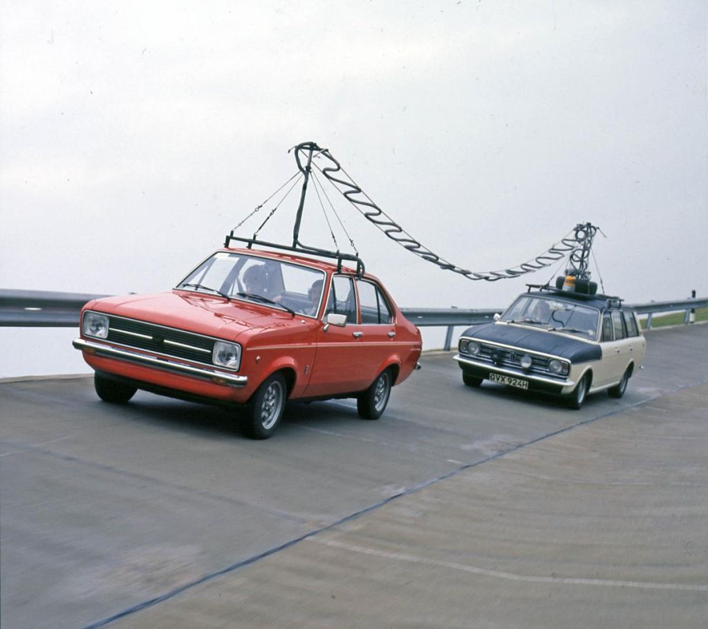 This week's image illustrates how technological advances in the second half of the 20th century encouraged greater electronic testing of Ford vehicles. In the 1970s with wireless data transfer still a generation away, engineers had to rely on imagination and careful driving to record the data they needed. The use of 'tethering' permitted bulky recording equipment to follow in the vehicle behind without affecting the test vehicle.