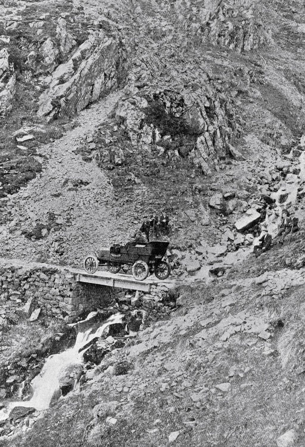 In 1911 Henry Alexander, a Ford agent based in Edinburgh, drove to the top of Ben Nevis to prove the ruggedness of the Ford Model T. The ascent took five days with the route leading over boulders, through snow-drifts and over perilous loose sand paths. At the top of Ben Nevis the Model T was met by the world's press before taking less than three hours to descend the mountain, traversing gradients steeper than 1 in 3.
