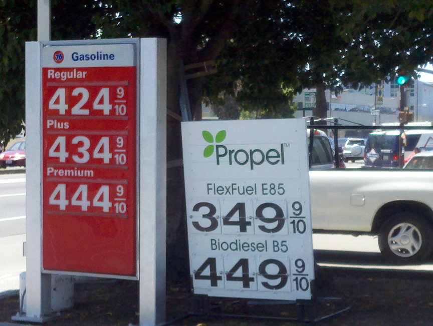 Well, by the time I got near SF, I was almost out of fuel. Not wanting to get busy looking for gasoline in The City, I stopped in Berkeley at a Union 76 station that I normally use. I use this station because they also have E85 (a blend of approximately 85% ethanol with 15% gasoline). As you all know, gasoline prices are ridiculous, and while news reports talk about the national average price nearing $4 per gallon for regular, California has had $4-plus prices for months.