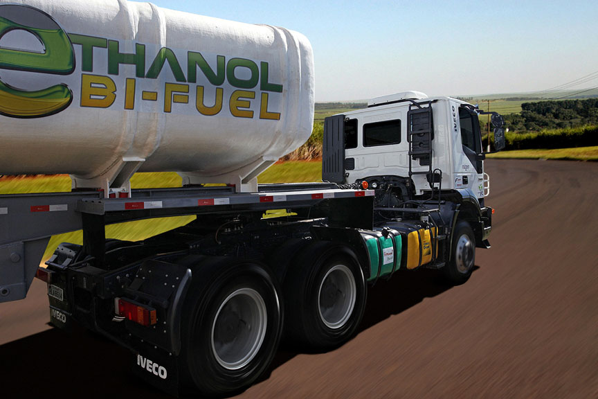 The Iveco Trakker Bi-Fuel prototype is a 6x4 truck used for 63 ton GCM that can be used in several applications on the sugar-cane plantations, such as articulated liquid tank transport. It uses a 360CvCommon Rail Cursor 9 engine. The truck has two fuel tanks (one for Diesel, another for ethanol). There is also an electronic control unit specifically dedicated to each fuel, a pressure pump for the ethanol system and a lambda sensor at the exhaust manifold. The ethanol is injected directly into the intake manifold during the admission stage. After the compression stage, the Diesel is injected to promote combustion. There is no need for antiknock additives of any kind.