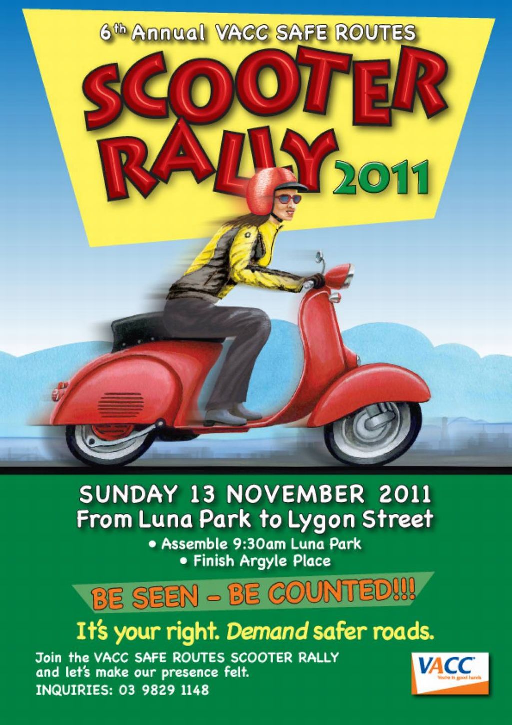 MELBOURNE – June 10, 2011: VACC’s ‘Safe Routes’ Scooter Rally is one of the biggest dates in the scooter calendar and VACC can announce that the date for this year’s event is November 13. Riders will once again meet at Luna Park and head to Argyle Square on Lygon Street.