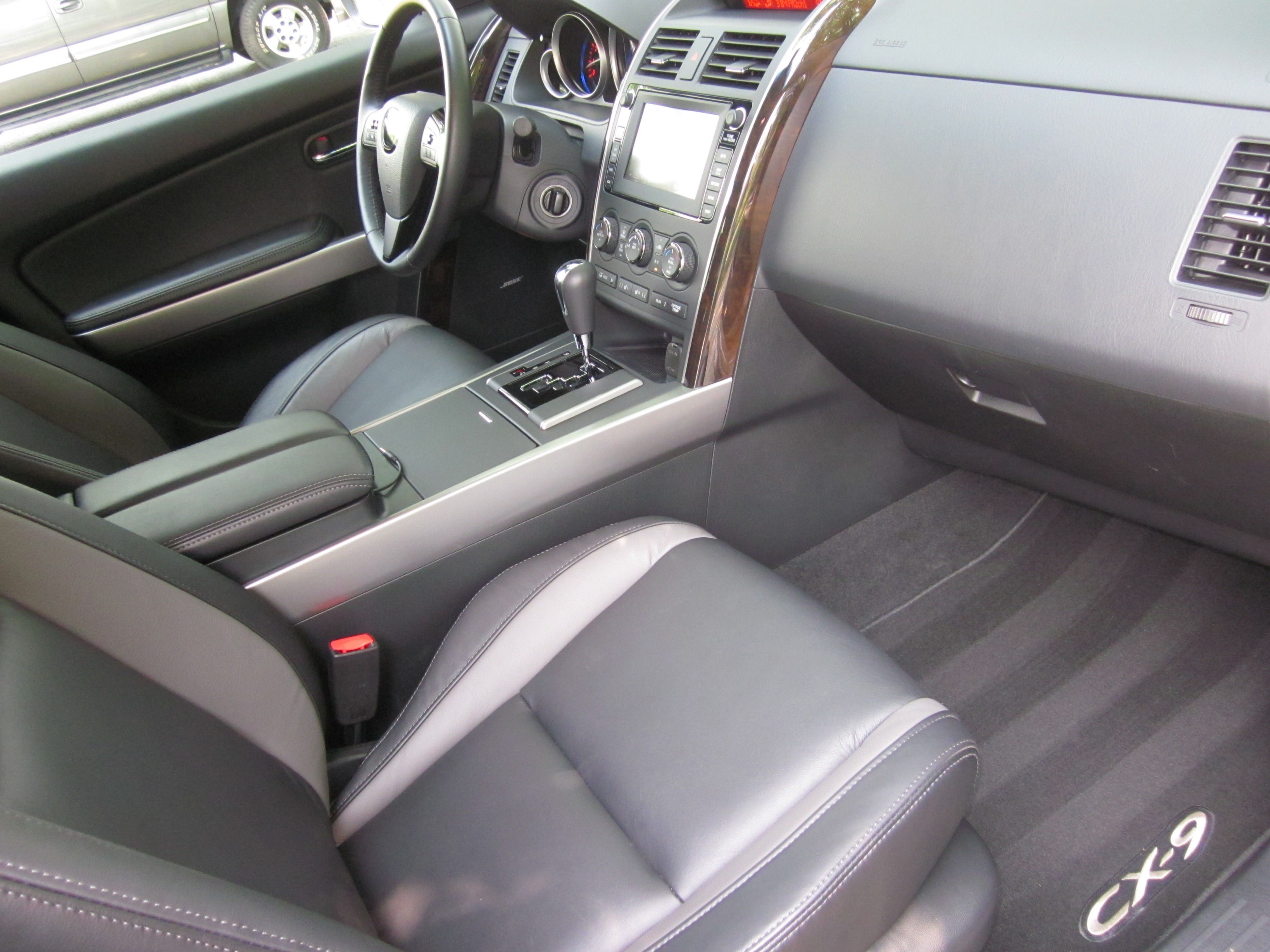 The CX-9 Sport is equipped with 18-inch aluminum wheels and tires, halogen headlamps, Bluetooth® hands-free phone capability and cloth upholstery. Power front seat adjusters are optional. The Touring model adds leather seat trim and power front-seat adjusters. The Grand Touring adds 20-inch aluminum wheels, bright exterior door handles, rain-sensing wipers, an anti-theft alarm system, exterior mirrors with turn indicators, a three-position memory driver’s seat, Blind Spot Monitoring system, Homelink auto-dimming rearview mirror, the Mazda Advanced Keyless Entry and Start System, wood-like instrument panel trim, wood-like door trim, indirect blue interior lighting and a silver finish for the side surfaces of the rear console.