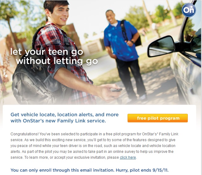 OnStar is conducting the pilot program to gauge consumer interest. Pilot services will include: Vehicle Locate: The subscriber can log on to the Family Link website to view a map with the vehicle's exact location at any time.