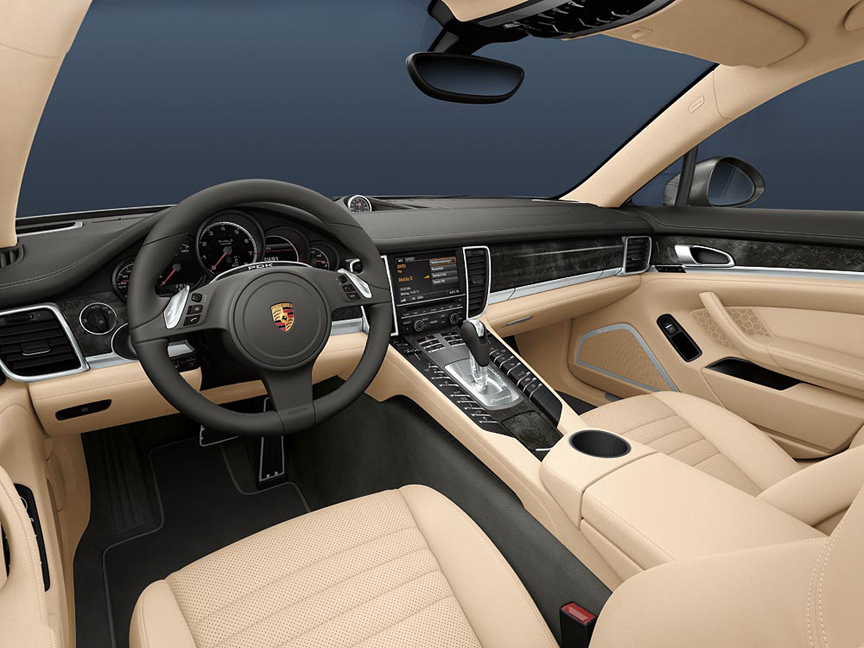 The sporty character of the new Panamera Turbo S is apparent not just in its performance but is also reflected on the exterior. The 20-inch Turbo II wheels with increased rear axle track width, side skirts from the Porsche Exclusive range and the adaptive extending four-way rear spoiler in the exterior color ensure particularly sporty performance and look. The fusion of exclusivity and sportiness is conveyed in the interior by the bi-color leather finish, fitted as standard. The new combination of black/cream is offered exclusively for the new Panamera Turbo S with agate grey/cream also being added as an exclusive combination from the autumn.