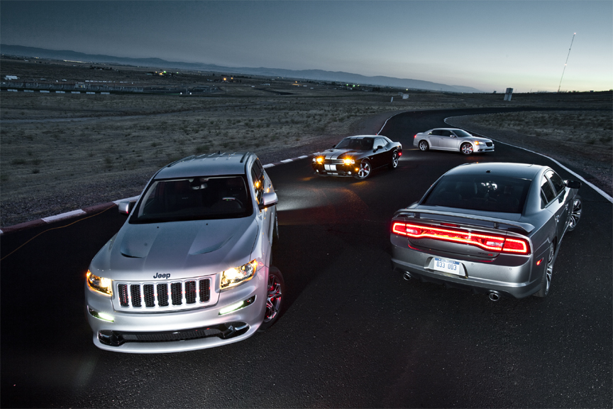 ![]() SRT Brand vehicles (L to R) 2012 Jeep Grand Cherokee SRT8, 2012 Dodge Challenger SRT8 392, 2012 Chrysler 300 SRT8, 2012 Dodge Charger SRT8 |