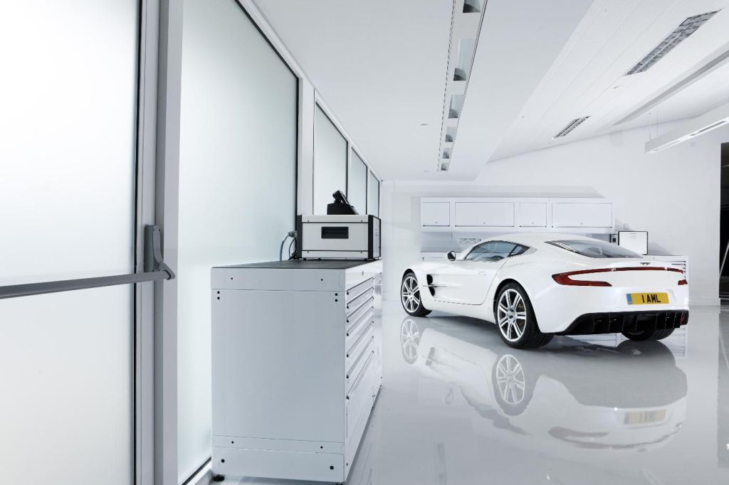 The One-77 facility is located in its own specially created standalone building within the company’s global headquarters in Gaydon, Warwickshire. Inside the facility the distinctive production space is laboratory-like in its design and detail, an open plan 1,000 sq m serene space with its white walls, floor and ceiling containing four build positions and a host of specialist equipment and tools. The facility is a marked departure from a conventional automotive production space, with each car remaining static throughout the build, rather than progressing from station to station.