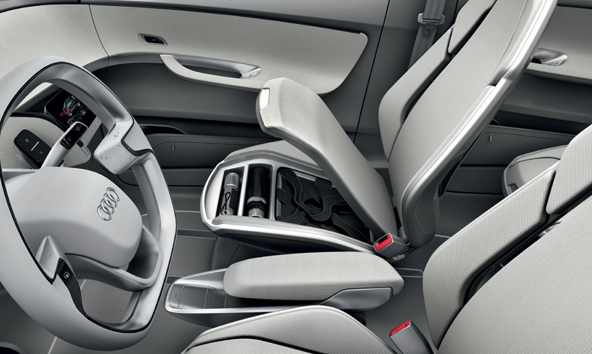 The Audi A2 concept has a flat interior floorboard. The center console is attached to the driver’s seat; the rear console extends forward between the two rear seats. The four individual seats add lightness, and there is storage space under the fold-up seat cushions. There is room between the rear seats for a city bicycle with its front wheel removed. The load area has two levels; a frame with functional nets creates the upper level.
