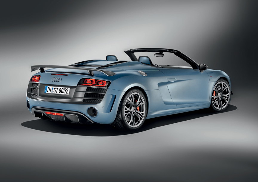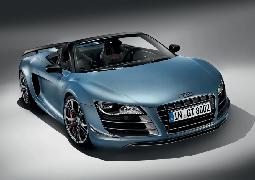 The 5.2-liter V10 with direct injection has been boosted to an output of 412 kW (560 hp). Exhaustive fine-tuning has reduced the R8 GT Coupé’s curb weight by 100 kilograms (220.46 lb) to 1,525 kilograms (3,362.05 lb), thus improving the power-to-weight ratio to 2.72 kilograms (6.00 lb) per hp. The soft-top R8 GT Spyder also demonstrates the Audi ultra-lightweight construction concept. Here the corresponding values are minus 85 kilograms (187.39 lb), 1,640 kilograms (3,615.58 lb) and 2.93 kilograms (6.46 lb) per hp.