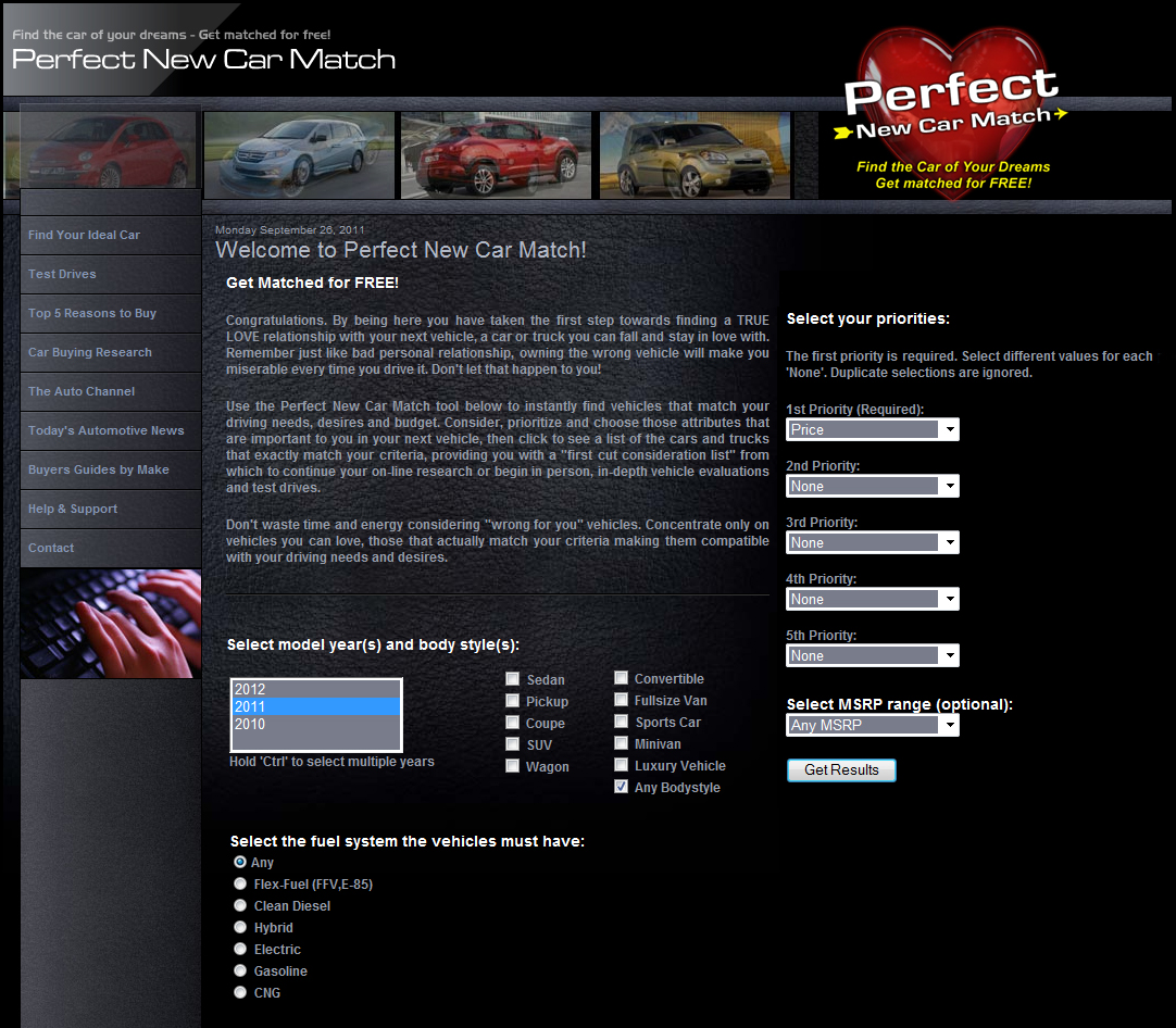 In addition, The Auto Channel offers the exclusive Perfect New Car Match system that's designed to help you locate the vehicle that's best suited for your needs. TACH's Perfect New Car Match can be found at www.PerfectNewCarMatch.com, of course.