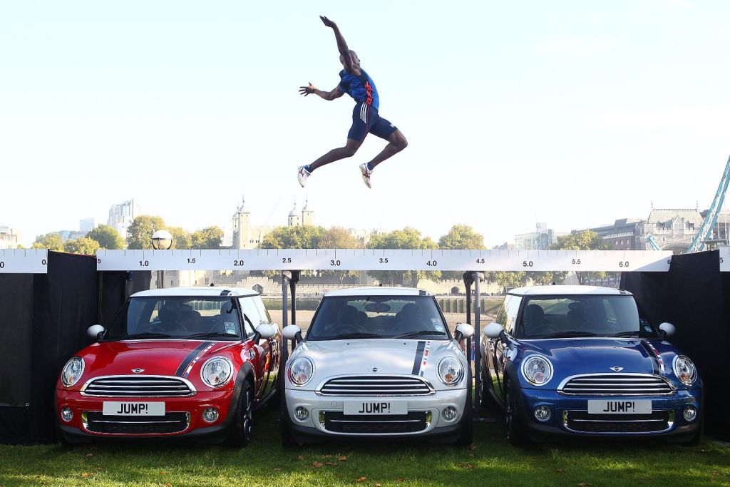 BRACKNELL, UNITED KINGDOM – Sept 29, 2011: England long jump champion J.J. Jegede succeeds in attempt to clear three MINI London 2012 Edition models.