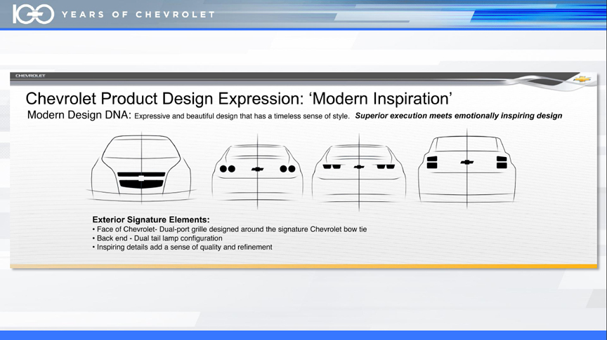 From GM’s design studios around the world - US, Germany, Korea, China and Brazil these design formats and cues are being followed as all-new-generations of Chevys are designed and built to meet the needs of its customers. New cars and trucks including the Sonic, Malibu, Spark, Orlando, Colorado and Camaro ZL0 are examples of new Chevys.