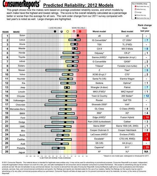 Full reliability history charts and predicted-reliability ratings on hundreds of 2012 models, plus a list of what’s up and what’s down, best and worst models, and a comparison chart of brands can be found online in our Reliability special section, in the December issue of the magazine, and in the upcoming Consumer Reports Cars publication, Best & Worst New Cars for 2012, on sale November 15, 2011.