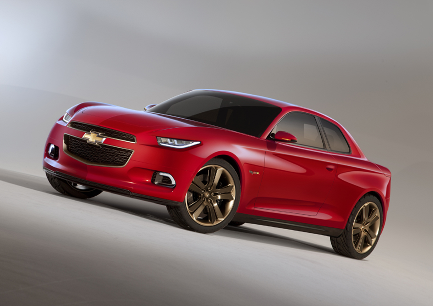 Code 130R, the first Chevrolet concept, is a four-seat coupe with a simple upright profile. Painted in an all-new red metallic paint with matte anodized gold wheels, Code 130R features heritage performance-inspired styling and rear-wheel drive. With an aggressive front fascia, Chevrolet fender flares, straight body side and Chevy crossflag emblem, Code 130R makes a link to Chevrolet’s performance heritage.