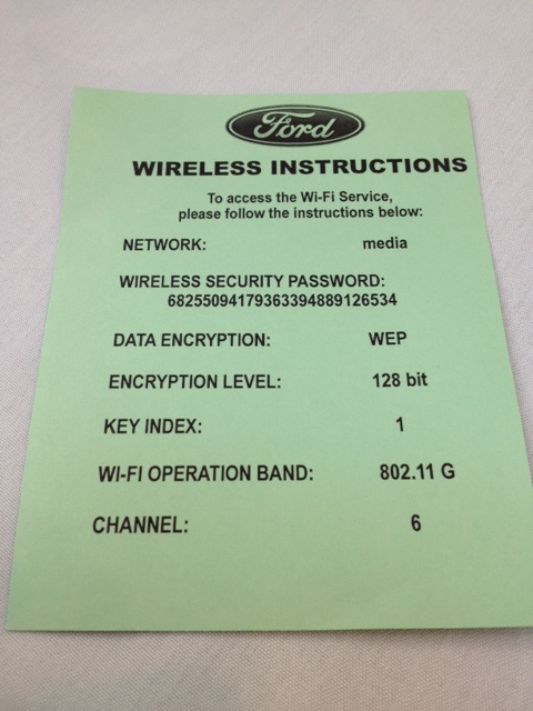 Anyone who is Internet literate be it on desktop, laptop or smart phone knows the vagaries of access to a WiFi network and passwords. This can be an especially daunting experience when trying to log-on to the web in a public venue and the available network is private but you’re missing the password. Ford solved the problem at the media event detailing the MFT improvements. Here’s the card that was on the luncheon tables with the password needed to log on to their media network.