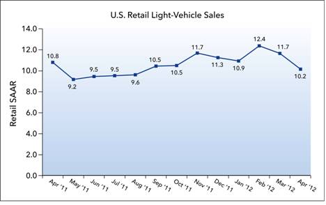 Based on the robust first quarter 2012 selling pace, which was 14.5 million units total and 11.7 million units retail, LMC Automotive is raising the light-vehicle sales forecast for the full year. The current forecast is now at 14.3 million units total light-vehicles (up from 14.1 million units) and 11.5 million units retail light-vehicles (up from 11.4 million units). An increase in fleet sales to 20 percent of total sales for the year is expected to outpace the increase in retail volume for 2012.