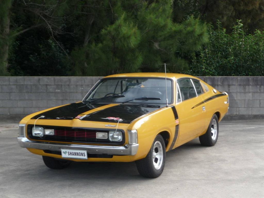 Pride of the brawny bunch is a matching numbers 1971 Chrysler Valiant VH Charger E38 R/T Coupe finished in trademark Hot Mustard.