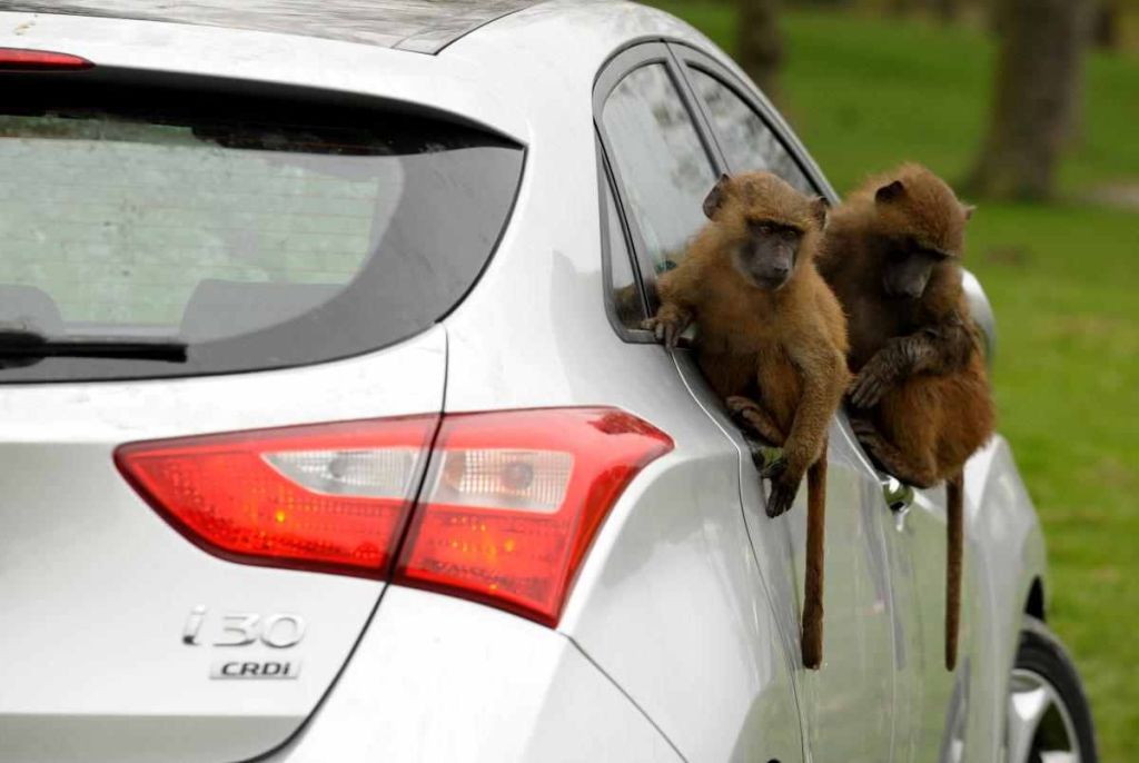 Baboons from Knowsley Safari Park were chosen for their well-known love of tearing park visitors’ cars apart – most famously Wayne Rooney’s vehicle when he visited the Merseyside attraction last year.