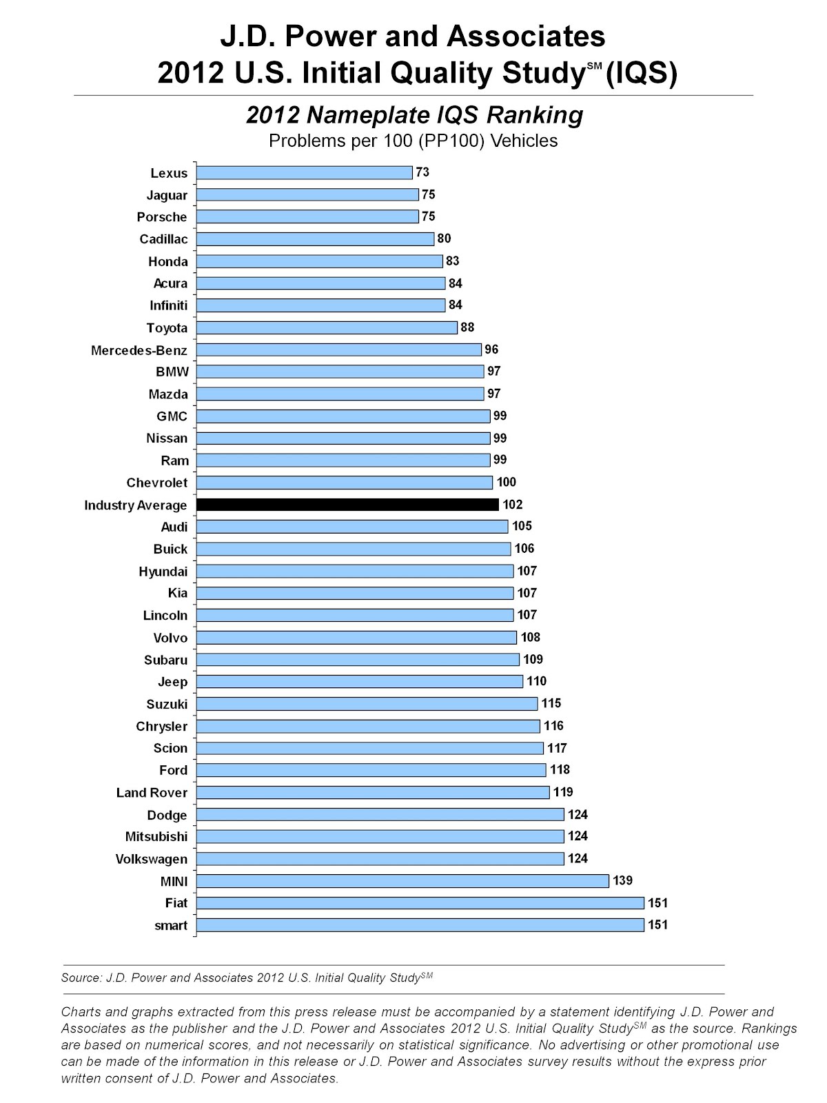 Mr. Sargent emphasized the breadth of the 2012 segment awards. “While in past years a handful of brands tended to collect numerous segment awards, 14 different brands receive segment awards in 2012 - only the second time in the history of the study that so many different brands achieved award status,” he said. “This is a positive indication of how widespread high quality is among automakers, with most brands producing a number of models with exceptional quality levels.”