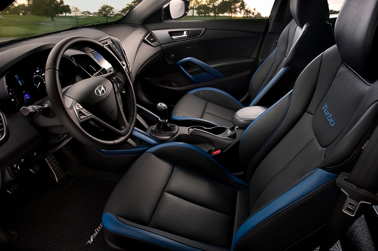Turbocharging Veloster adds $4500 to the price tag, which is totally deceptive. For those bucks you snap up far more than power, which claims 201 ponies and hugely improved 195 pound-feet of torque on regular grade (!) fuel. That forty-five hundred gets you everything but a matte gray paint option (more on that later) and automatic transmission. The feature list is so lengthy we’ll only hit highlights, like unique suspension tuning, projector headlamps with LED accents, rear air diffuser with center-mounted sport tuned exhaust, upgraded leather accented interior with Turbo embroidery and 8-way power driver’s seat, AC with air filtration, proximity key with push-button start, touch screen audio (AM/FM, satellite, CD-MP3) rocking 450 Watts through eight speakers and sub, Bluetooth connections plus AUX inputs, Blue Link telematics system and voice recognition, and yes, lots more. Standard features are so inclusive that a single option package with panoramic sunroof, backup warning with navigation and rearview camera, and a 115V outlet is offered. Oh, and the automatic transmission. If you’re wondering why no Dual Clutch Transmission, the Turbo’s torque would totally chew it up.